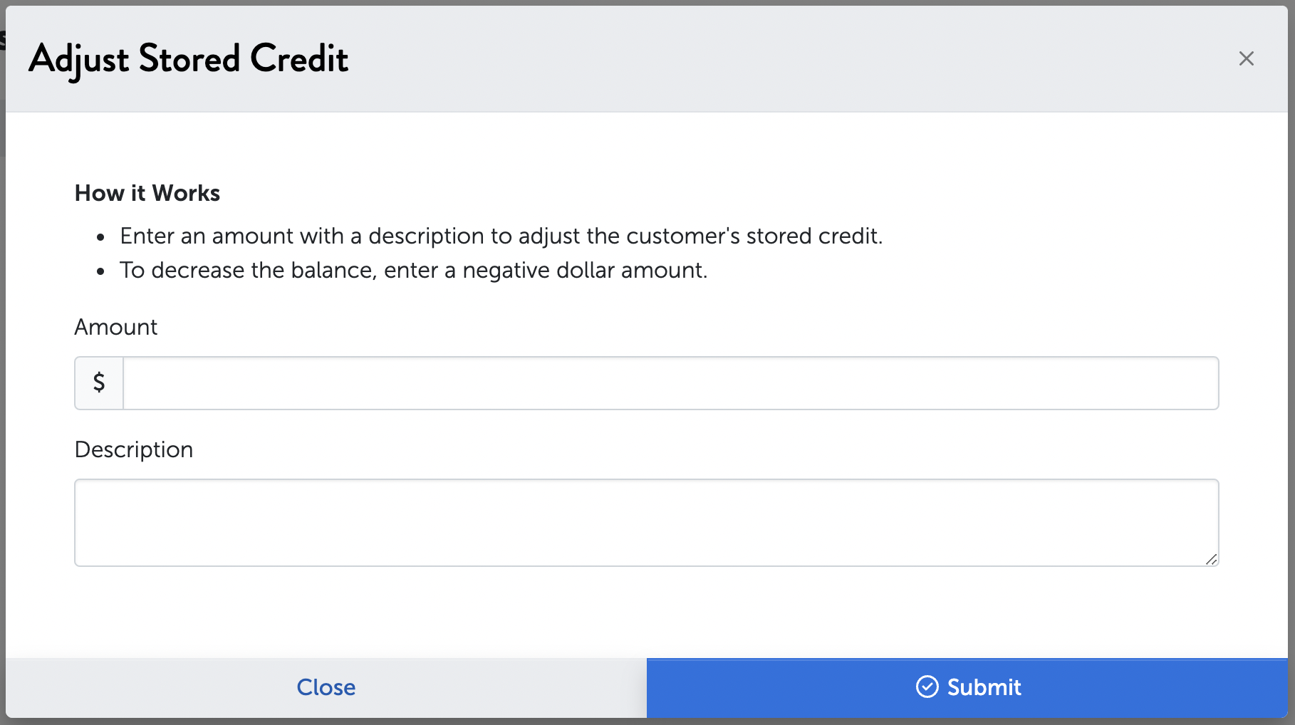 - Click Adjust and enter the amount purchased by the gift purchaser and a description, then click Submit.