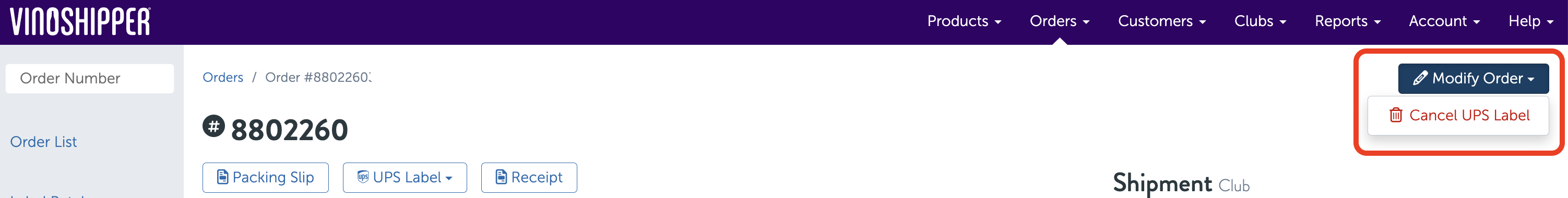 If a UPS label has already been created: click MODIFY ORDER in the top right corner and then click CANCEL UPS LABEL.