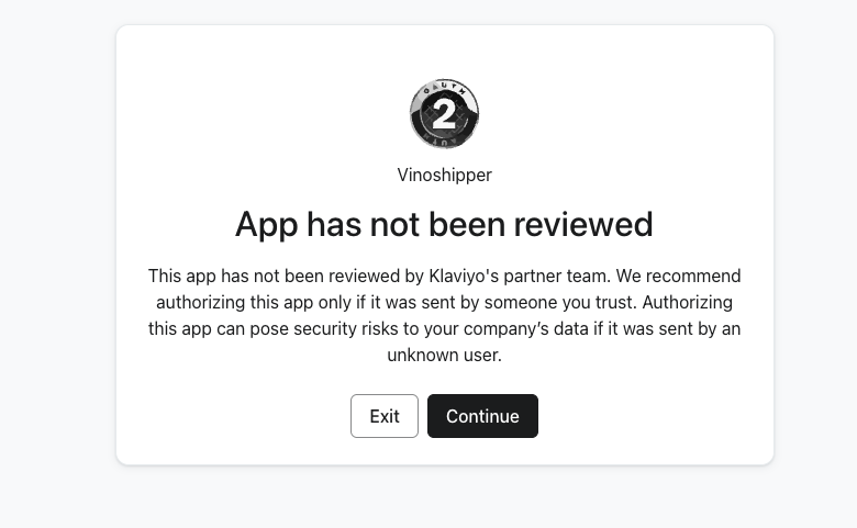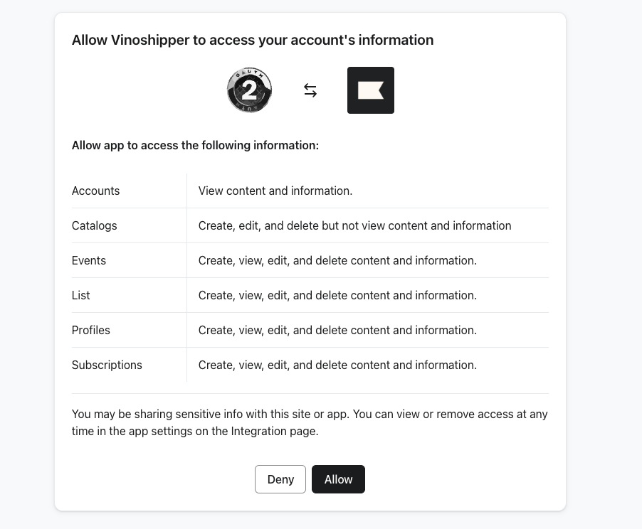 - Select continue, and then proceed to the next screen and allow Vinoshipper to access your Klaviyo account's information in order to sync data to Klavyio.